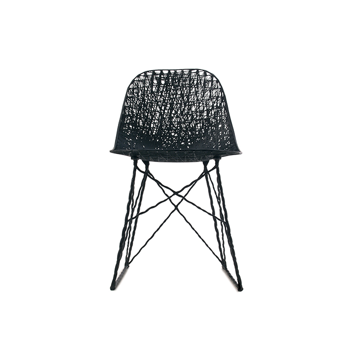 出自Bertjan Pot和Marcel Wanders为Moooi设计的carbon chair,全椅使用质轻、坚硬的碳纤维打造,每条碳纤维则是由更细小的数千条碳纤维组成,以不规则网织状编织而成,让它有着异于凡品的坚韧张力。雾黑的气息,在古典的韵味中,流露出现代的先进科技,像鸟巢一般的编织,有着回到家的温暖和安逸。