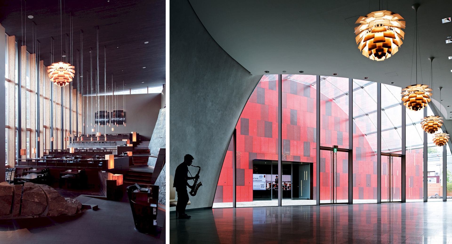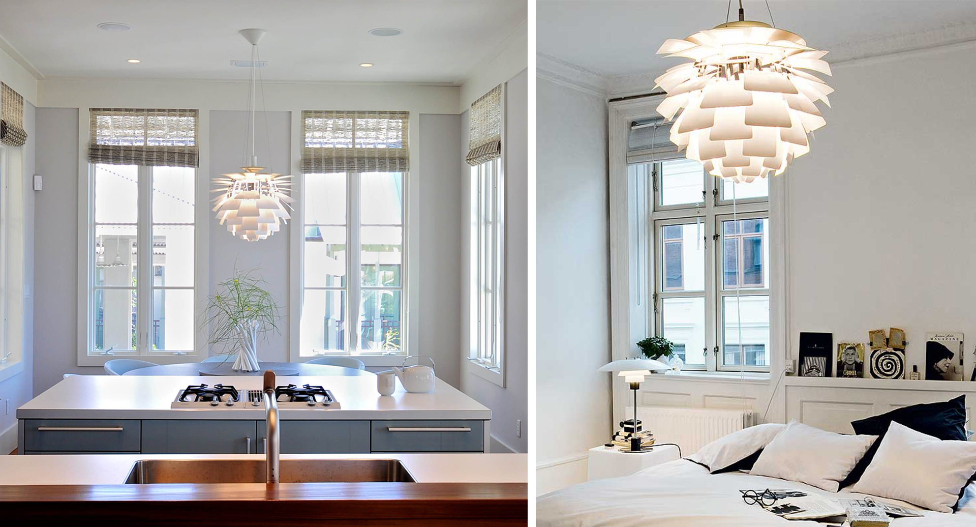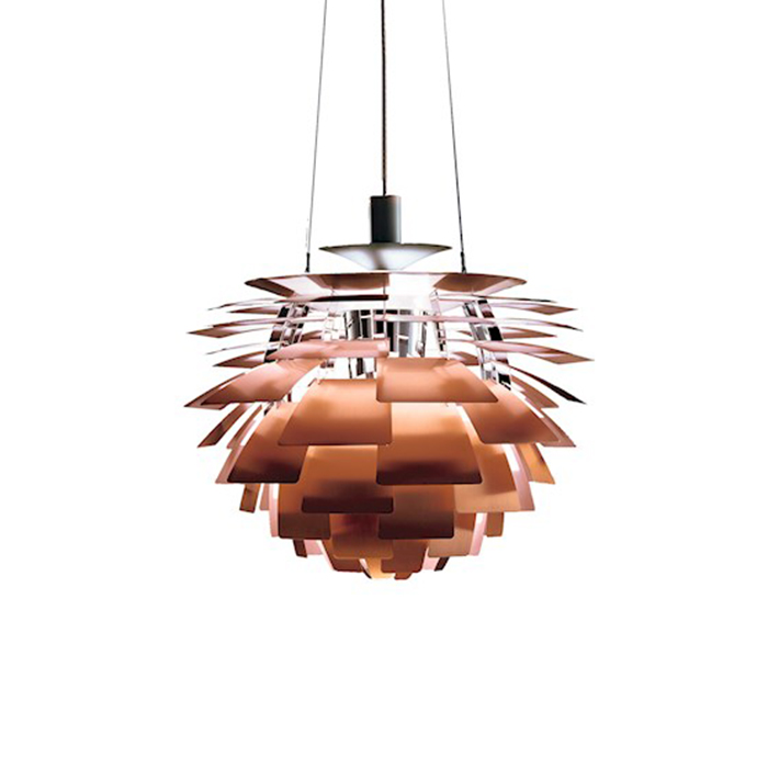 丹麦灯具品牌Louis Poulsen的经典PH系列。出自丹麦设计师Poul Henningsen之手,灯具外围遮掩设计,从任何角度都看不到发光灯源;全部光源以反射、折射的方式到达照射区面,以此生成柔和光线;多片灯罩的设计让边缘可以溢出部分光线,令环境更为融合协调。