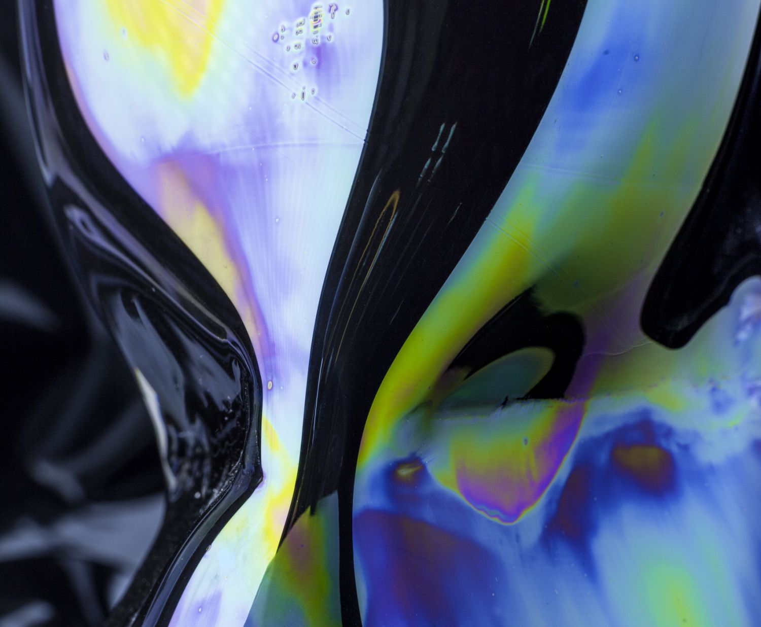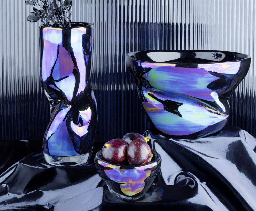 A series of opulent vases and bowls with a lustrous, iridescent finish inspired by the effect of a petrol spill on a wet day or a hummingbird's wing. Warp Vase is hand formed so each container is unique in colour, shape and texture.