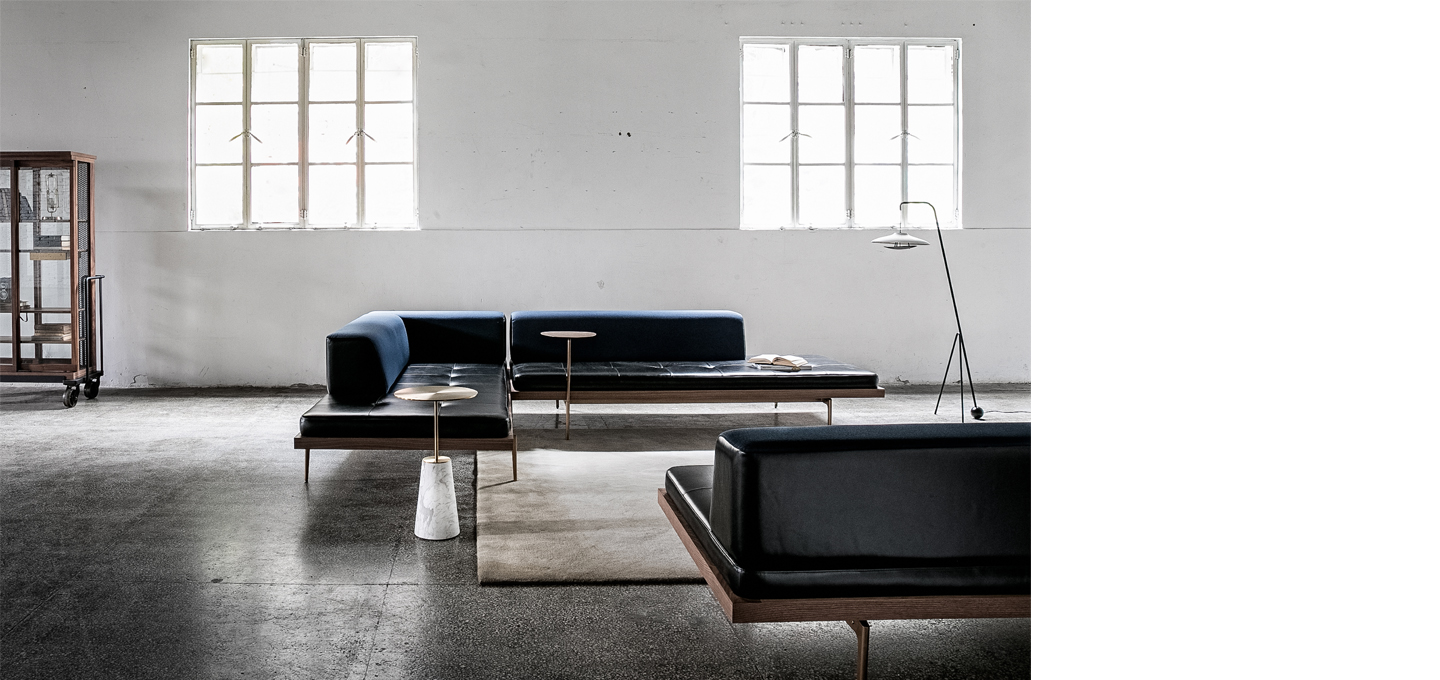 纪律沙发,木制平面作为四种软垫的基础。由精致的金属支腿支撑,平台悬浮在地面上方,其简单的几何形状和精心校准的尺寸可实现各个单元的无缝聚合。沙发的变体可以无限配置组合,用于各种功能,从紧密的两件式“L”到20米长的长凳,甚至背对背摆放成为独特的陈设。