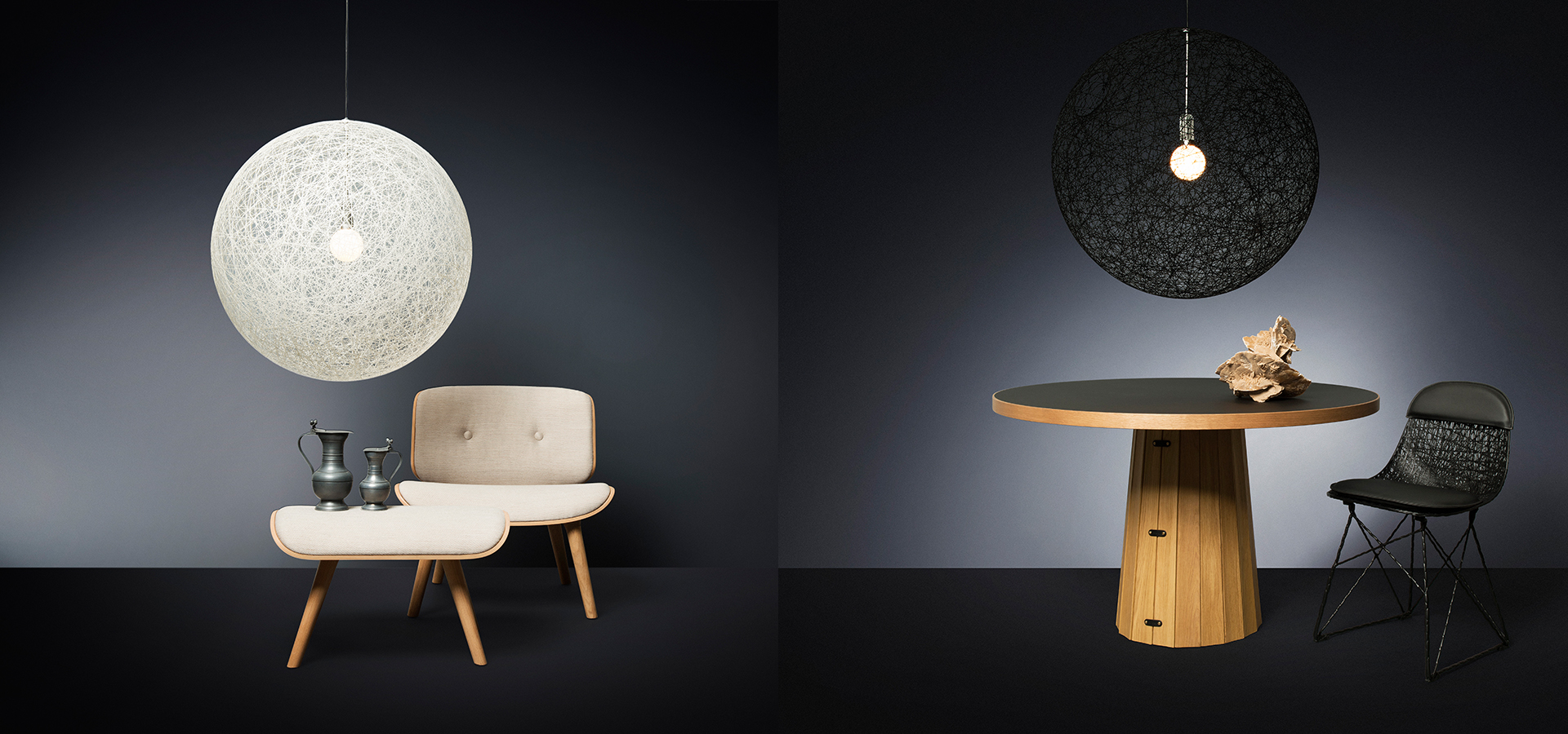 由Bertjan Pot为Moooi设计的Random Light自2002年问世来就成为了畅销产品。它传达的简单,柔和,轻盈之感展现了现代风格的魅力。Random Light的制作过程也讲述了一段专属于它的故事:首先将(Resin Drained Yarn)纱线随意的缠绕在可充气的沙滩球上塑造一个半透明的3D纤维框架,然后使球体泄气并将其从灯顶部的开口抽出,最后这个纤维框架就是我们看到的Random light。