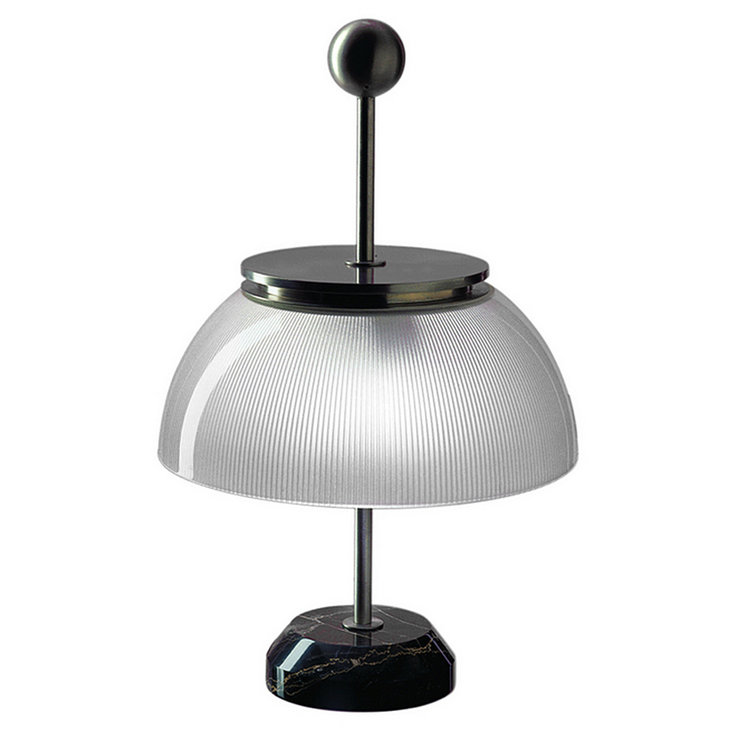 由 Sergio Mazza 于 1959 年设计的 Alfa 台灯是意大利照明设计的标志。它的波纹状半透明晶体阴影产生柔和的散射光。富有艺术气息的玻璃灯罩位于手工转动的镀镍杆和黑色大理石底座上。